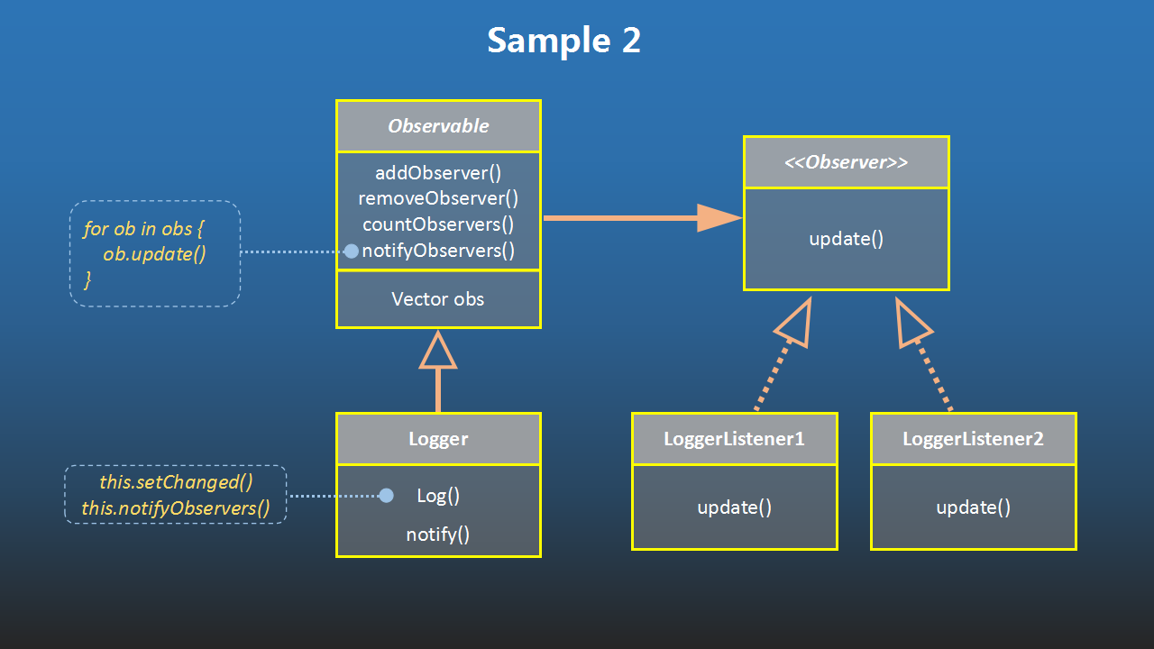 图中被观察者(Observerable)和观察者(Observer)之间形成一对多的关系,其中,